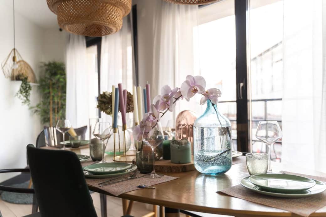 -Grand espace repas avec table et chaises.