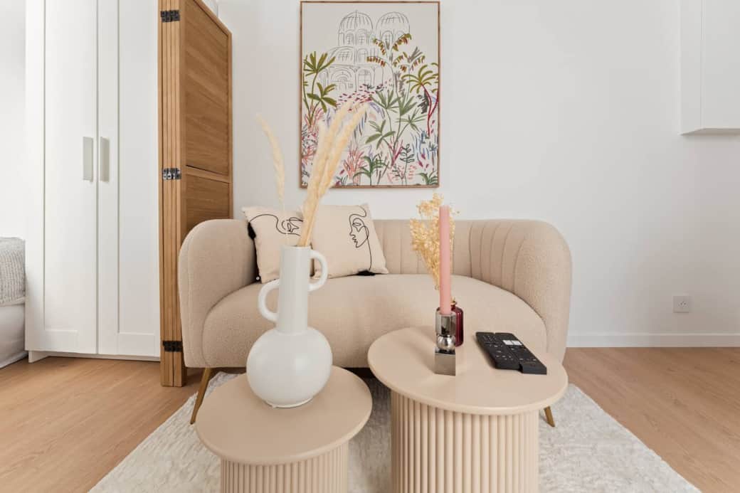 l'appartement se compose d'un séjour lumineux ainsi que d'un coin nuit en alcôve avec un lit double, et d'une cuisine moderne parfaitement intégrée.
