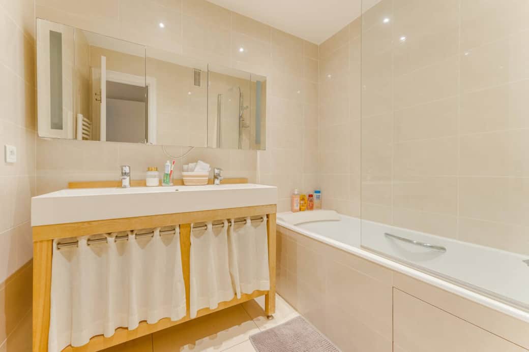 🛁 Salle de bain élégante avec baignoire et produits de toilette inclus pour un maximum de confort.